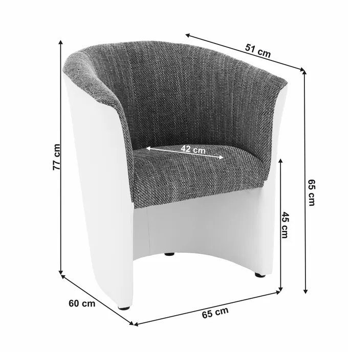 Praktické konferenčné klubové kreslo v ponuke v kombinácii biela ekokoža / látka šenil melír Lava 5. Kreslo pôsobí čistým dojmom vďaka bielej ekokoži, na sedení je použitá kvalitná poťahová látka typu Lava sivej farby. Kreslo je svojou konštrukciou ideálne nielen ku konferenčným stolíkom, ale aj k jedálenským a písacím stolom.