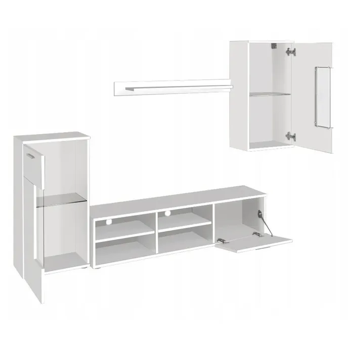 Obývacia stena FRONTAL 1 je v ponuke v bielej farbe. Jednoduchá, ale zároveň elegantná obývacia stena je rozmerovo menšia, vhodná aj do panelákových bytov.