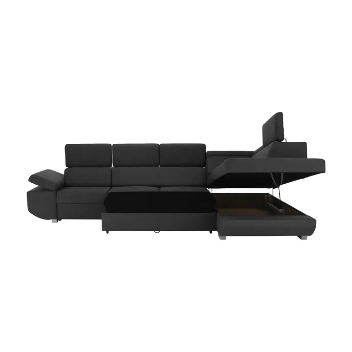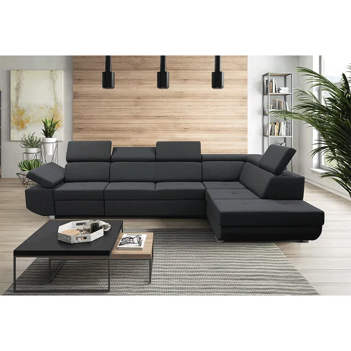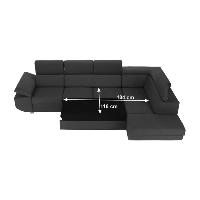 Výrobca sedačku obdaril 4 polohovacími opierkami hlavy. Navyše je sedačka aj rozkladacia. Určite jej nechýba ani úložný priestor. Sedačka zaberie v miestnosti priestor o rozmeroch šxhxv 345x220x103 cm. Po roztiahnutí sedačky získate plochu na spanie o rozmeroch 118x184 cm. Sedačka s pružinovým sedením je na obrázku v pravom prevedení, možnosť objednať aj ľavé. Sedačka disponuje opierkou na ruky s funkciou sklápania.